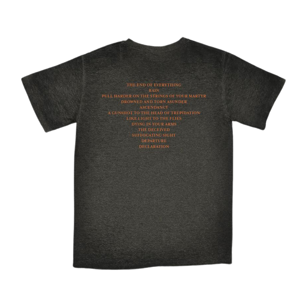 Iconic Ascendancy art on a unisex vintage acid wash black t-shirt and track list on the back.