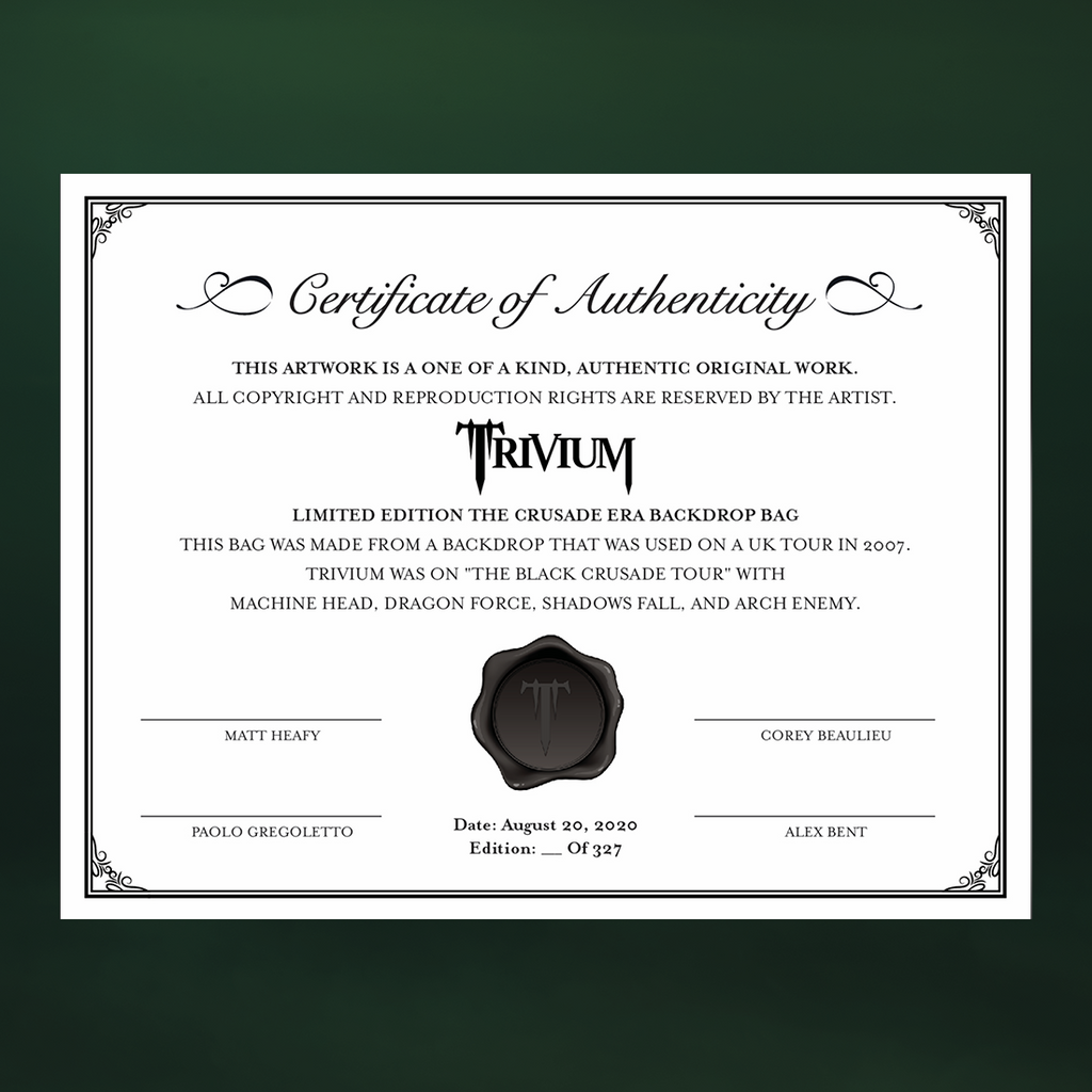 The Backdrop Bag (Small) is a 8"" W x 6"" H canvas bag with one zipper pocket, handmade by the artist Moon Rider (@m00nrider). Each bag is custom sewn from an authentic 2007 tour backdrop and the print on each bag will vary due to the nature of the backdrop design. There are only 109 limited edition small size backdrop bags. Each bag will come with a certificate of authenticity which is hand numbered and signed by all members of Trivium.